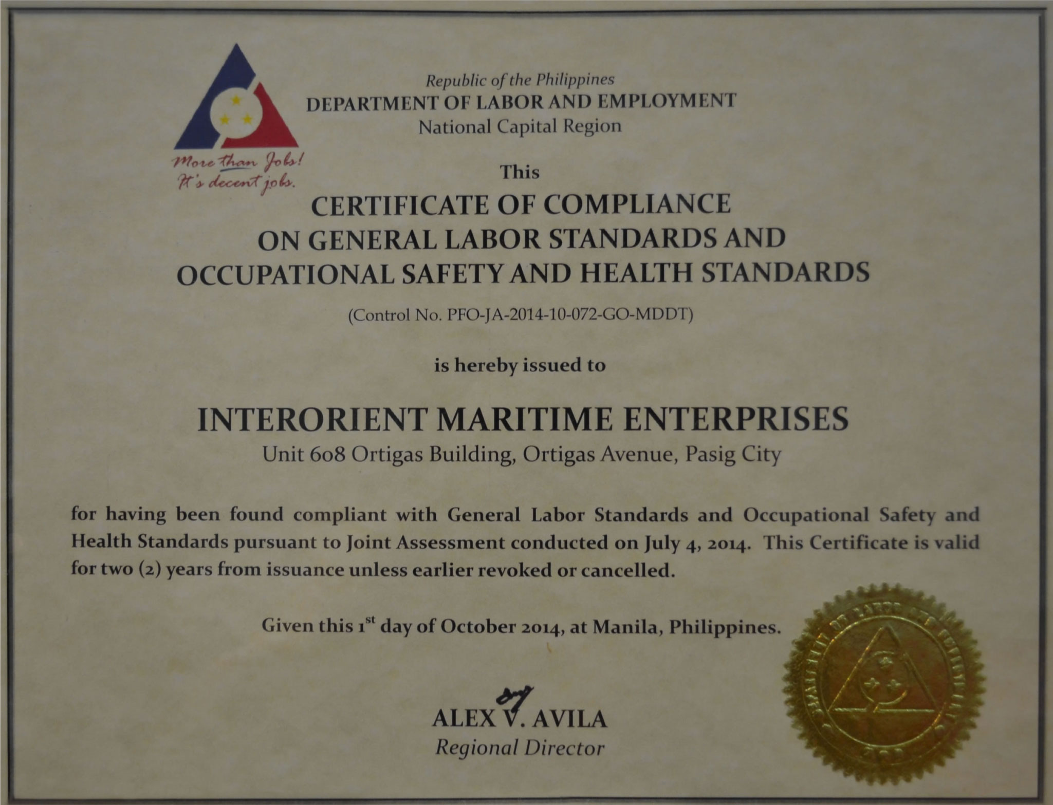 Interorient was awarded by the Department of Labor and Employment (DOLE) with a "Certificate of Compliance on General Labor Standards and Occupational Safety & Health Standards". The Awarding Ceremony was held last October 1, 2014 at the Ichikawa Hall ...